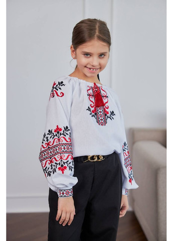 Вышиванка с длинными пышными рукавами, украшенными густой орнаментальной вышивкой с геометрическими и растительными мотивами. На груди расположен вертикальный вышитый элемент с декоративными завязками и кистью. Манжеты и верх рукавов украшены гармонично сочетающимися узорами с основным декором. Ткань имеет приятную фактуру, а крой свободен и удобен, что позволяет носить изделие как в праздничных, так и в повседневных образах.