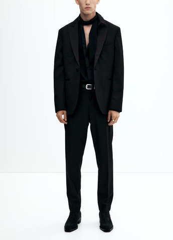 Однобортный смокинговый пиджак из шерсти смеси с атласными деталями. Одна обтянутая пуговица спереди, один нагрудный карман, два прорезных кармана и три внутренних кармана. Обтянутые пуговицы на рукавах и двойная шлица сзади. Приталенный крой, адаптирующийся к контурам тела и создающий обтекаемый силуэт. На подкладке.