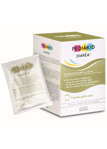 PEDIAKID НАТУРАЛЬНЫЕ САШЕ ПРОТИВ ДИАРЕИ / PEDIAKID DIAREA, 7 пакетиковСимбиотик на основе специальных штаммов пробиотиков, а также пребиотиков против диареи.2 зарегистрированных штамма пробиотиков с гарантированным содержанием 10 млрд/сашеТакже пригодно случае острого гастроэнтерита или диареи, вызванной антибиотикамиОт рожденияНезрелость иммунной системы ребенка делает его более восприимчивым к инфекциям, чем взрослый. Гастроэнтерит младенцев и детей - самая частая причина заражения детей раннего возраста во всем мире. (Ruemmele 2007). Частота эпизодов диареи колеблется от 1 до 3 в год на ребенка.По данным Национального института безопасности и исследований Франции, почти все дети в возрасте до 2–3 лет уже инфицированы ротавирусами.Диетическая ценность: 1 пакетик содержит, в среднем:Пробиотические лактоферменты: Экв. 10 млрд КОЕ*, в т.ч.: Bifidobacterium animalis subsp lactis Lafti®B94 - 5 млрд КОЕ*, Lactobacillus rhamnosus Rosell®-11 - 5 млрд КОЕ*; *КОЕ – колонеобразующая единица- Уменьшают частоту и объем стула; - Снижают продолжительность эпизода диареиFIBREGUM® - пребиотические волокна акации – 500 мг- Стимулируют рост «хороших» кишечных бактерий и усиливают действие интегрированных (симбиотических) пробиотиков.Без глютена, без лактозы, без аллергенов, без ароматизаторовВспомогательное вещество: мальтодекстрин.Рекомендации по приему: от рождения, 1 пакетик в день, разведя в бутылочке для кормления или стакане воды (<37 ° C). Желательно принимать до или во время еды. Этот препарат следует использовать вместе с раствором для пероральной регидратации в течение 7 дней.Форма выпуска: упаковка 7 пакетиков-саше для разведения.Условия хранения: Хранить в упаковке производителя в сухом месте, защищенном от света, высоких температур, влажности, недоступном для детей.Изготовитель: Лаборатория ИНЕЛДЕА, Франция, 06510, Карро, ЗИ Карро, 4-Авеню - 10-Ру.
