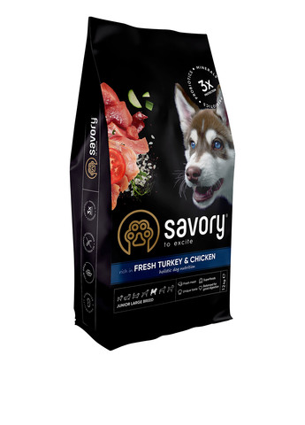 Корм класса холистик для щенков больших пород от 3 до 18/30 месяцев. Полнорационный сухой корм для щенков крупных пород Savory пробудит у вашего любимца ту жизненную энергию, о которой он даже сам еще не знал. Эксклюзивная рецептура корма была разработана опытными европейскими специалистами по питанию домашних питомцев. Используя холистический подход, удалось создать биологически подходящий, здоровый рацион для собак, который полезен и вкусен настолько, что кавычки оближешь. Сочетание отборных натуральных ингредиентов позволяет заботиться о здоровье четырехлапого, а изысканный вкус – дарить ему наслаждение от ежедневного потребления корма Savory. Сухой корм для щенков больших пород Savory содержит качественное мясо индейки и курицы, суперфуды, яблоки, шпинат и куркуму. Эти составляющие сделаны природой для рационального роста, защиты суставов и развитой мускулатуры у молодых великанов. Достоинства: Ценный источник белков – мясо индейки и курицы. Уникальный комплекс пребиотиков, пробиотиков и минералов для укрепления иммунитета. Поддержание оптимального веса – равномерный набор мышечной массы без откладывания жира. Суперфуды для гармоничного развития и комфорта пищеварения. Содержит хондропротекторы для здорового формирования, укрепления и защиты суставов. Сбалансированный низкозерновой состав. Без красителей и ароматизаторов. Особенности: Индейка – высокобелковое диетическое мясо, которое легко усваивается и имеет в своем составе жизненно важные минералы: селен, цинк, натрий, фосфор, магний, калий и витамины группы B. Курица – низкоуглеводное мясо, которое является отличным источником протеина и обогащает корм минералами и витаминами. Яблоки являются источником пребиотиков (олигосахаридов), улучшающих здоровье микрофлоры кишечника. Лососевое масло насыщено жирными кислотами Омега-3, которые повышают общий иммунитет и придают блеск шерсти. Белый рис – диетический компонент с благоприятным действием на пищеварительную систему. Цуккини богаты витамином С для укрепления иммунитета и являются источником растворимой клетчатки для нормализации пищеварительных процессов. Кокосовое молоко оказывает интенсивное противовоспалительное и антибактериальное действие. Улучшает работу ЖКТ, состояние кожи и сердца, поддерживает оптимальную кондицию организма. Семена чиа – суперфуд с высокой концентрацией кальция, антиоксидантов и ненасыщенных жирных кислот для правильного функционирования организма животного. Семена киноа содержат калий, рутин, минеральные соли, каротин, эфирные масла, а также важные для работы желудочно-кишечного тракта пектин и клетчатку. Помидоры являются источником антиоксидантов, которые обладают интенсивным противовоспалительным эффектом, улучшают состояние кожи, работу мозга и защищают сердце. Шпинат – источник витаминов группы В, снижает процессы окисления в организме, нормализует АД. Куркума уменьшает воспаление, оказывает антибактериальный эффект. Корм Savory – полезное может быть вкусно! Состав: дегидратированная курица (35%), рис, свежая индейка (15%), куриный жир, сушеные яблоки, горох, лососевое масло, гидролизованная куриная печень, дрожжи, сушеные кабачки (1%), сухое кокосовое молоко (0,5%) ), семена чиа (0,5%), семена киноа (0,5%), сушеные помидоры (0,5%), сушеный шпинат (0,5%), гороховая мука, куркума су