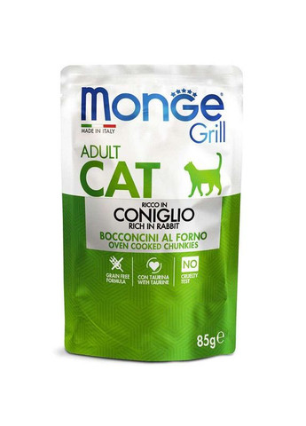 Монж Гриль – это безумно вкусные и ароматные кусочки в желе, которые так любят все котики, даже те, кто привередлив в еде. Данное питание укрепляет иммунитет животного, поддерживает в прекрасном состоянии кожу и шерсть. Ваш котик будет здоровым и жизнерадостным. Преимущества и особенности: качественный корм из Италии; не содержит растительных белков, злаковых культур и субпродуктов; без консервантов и красителей; оптимальный баланс Омега-3 и Омега-6 жирных кислот способствует идеальному внешнему виду питомца; в состав не входит сахар; в рационе содержатся все важнейшие антиоксиданты; вкусный и ароматный сбалансированный корм, изготовленный при помощи специальной технологии; выпускается в удобной упаковке – паучах. Состав: мясо и продукты животного происхождения (итальянское свежее мясо кролика 35% и свинина 10%), масла и жиры (лососевое масло 2%), овощи (картофель), минеральные вещества, молочный протеиновый порошок. Аналитический состав: сырой белок: 9,7%; сырая клетчатка: 0,5%; сырой жир: 3,8%; сырая зола: 2,5%; влажность: 80% Добавки: Пищевые добавки/кг: витамин D3: 180 МЕ; витамин Е (all-rac-альфа-токоферилацетат): 40 мг; железо (моногидрат сульфата железа (II)): 13 мг; йод (йодат кальция): 1,6 мг; медь ( пентагидрат сульфата меди (II): 3,4 мг, марганец (моногидрат сульфата марганца): 8,5 мг; цинк (оксид цинка): 42 мг; селен (селенит натрия): 0,04 мг; таурин 500 мг/кг Технологические добавки: гелеобразователи и эмульгаторы. Рекомендации по кормлению: рекомендуемый дневной рацион, указанный в таблице, можно разделить на 2 приема пищи. Адаптируйте количество, в зависимости от размера, активности и образа жизни животного. Убедитесь, что свежая, чистая вода всегда доступна. Когда этот продукт заменяет другой тип, рекомендуется вводить его постепенно в течение, как минимум 1 недели. После вскрытия пауч хранить в холодильнике и использовать в течение 3 дней. Вес кота, кг 3 4 5 6 Количество корма, г/сутки 164 200 230 261 Фасовка: 85 г