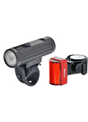 Набор велосипедных фонарей ProX Передний фонарь с USB-аккумулятором, световой поток: 600 лм Светодиоды: CREE XP-G2 + 2 SMD, двойной световой луч Dual Distance Beam Индикатор уровня заряда, встроенная противотуманная фара (2 жёлтых SMD) 4 режима: 100% (3 ч), 50% (5 ч), мигающий/чередующийся (24 ч), противотуманный (3 ч) Аккумулятор: Li-Ion 18650, 2600 мА·ч; зарядка — micro USB (около 4,5 ч) Материалы: алюминий / ABS / PVC; водонепроницаемость: IPX4 Крепление: регулируемый резиновый хомут 22–31,8 мм, поворот 360° Размеры: 95 × Ø30 × 36 мм; вес: 129 г Задний фонарь с USB-аккумулятором, мощность: 80 лм COB LED, угол освещения 180°, 6 режимов (постоянные и мигающие) Аккумулятор: литий-полимерный, 500 мА·ч, зарядка micro USB (2 ч) Функция запоминания последнего режима Материалы: алюминий / ABS / PP; класс защиты IPX4 Размеры: 44 × 27 × 30 мм; вес: 49 г В комплекте: крепление с резиновым кольцом, клипса, кабель micro USB