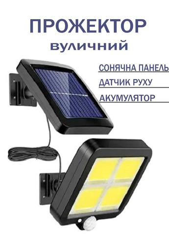 Уличный прожектор с солнечной батареей BK128-4COB аккумуляторный с датчиком движения Уличный фонарь работает от солнечных батарей и поэтому Вам не нужно беспокоиться о его подзарядке или подключении к сети. Может быть использован для охраны различных объектов на предприятиях и не только, для освещения парковок, скверов, территории около дома и т.п. Преимущества Простой монтаж Влагозащитный корпус Управление пультом Современный дизайн Характеристики Высота: 26 см Длина: 15 см Ширина: 2.6 см Количество светодиодов: 120 Цвет: черный