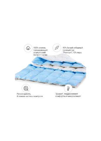 – это головокружительный комфорт и феерия удовольствия! С легкостью пуховых изделий не сравниться ни один синтетический наполнитель! Пуховое одеяло как воздушное облако, которое нежно обволакивает благодатным теплом, при этом оставаясь полностью невесомым как пушинка! Ни один синтетический наполнитель никогда не будет таким мягким и воздушным как пух, а правильная обработка пуха гарантирует его антиаллергенность, долговечность и высочайшие потребительские свойства. Именно эти качества пуха сделают Ваш сон великолепным. Вы сможете насладиться каждой минутой, проведенной в кровати и получить полноценный и ЗДОРОВЫЙ СОН!! Ткань итальянский батист Ткань состоит из 100% прочного египетского хлопка, который придает мягкость, легкость, нежность и истинно королевский вид изделиям. Имеет гладкую поверхность, что исключает раздражение кожи, обладает удивительной терморегуляцией и поддерживает комфортный микроклимат в постели, не создает парникового эффекта. Наполнитель Пух -90% пух "Премиум white" 90% пух "Премиум" - це отборный белый пух прижизненной ощипи птицы. Со 100 кг пуха можно получить лишь 25 - 27 кг пуха "Premium". Он качественный и, соответственно, дорогой пух. Пух собран в определённый период времени, когда качество пуха соответствует максимальным потребительским свойствам (согласно ГОСТ 30332-95). Пуховое ядро белого цвета класса "Premium" крупное. Показатели по эластичности, упругости, степени восстановления равны не менее Fill Power 700. "Premium" класс проходит дополнительные две мойки и антиаллергенные обработки, сортировки, лабораторное тестирование. Ручной пошив «Hand Made» Неповторимость, эксклюзивность и уникальность изделию придает процесс его изготовления. Два товара могут быть визуально похожи друг на друга, но обязательно найдутся отличия, особенные детали. Изделия серии «Hand Made» всегда будут радовать Вас не только своей уникальностью, но и качеством пошива, аккуратностью швов и красотой! Вот этим и ценна ручная работа, в сравнении с серийным производством домашнего текстиля, что создается на машинах. Изделия HAND MADE, естественно, имеют свою обоснованную цену, которая доступна истинным ценителям качества во всем. Мы предлагаем оригинальные подушки и одеяла серии HAND MADE ручной работы. В чем же ее преимущество?ручная сортировка антиаллергенного наполнителя;только ручной пошив;исключительно качественные материалы;итальянские ткани;детальный и тщательный контроль качества. При производстве серии «Hand Made» используется исключительно ручной труд, ни одна машина не сможет на 100% проконтролировать качество подушек и одеял так, как это делают специалисты с многолетним опытом. ОСНОВНЫЕ ХАРАКТЕРИСТИКИЧехол : Итальянский Батист (сатинового плетения), 100% хлопокНаполнитель : 90% гусиный белый пух “Premium” категории, 10% пероТеплота : Зима (от 15 до 20 градусов)