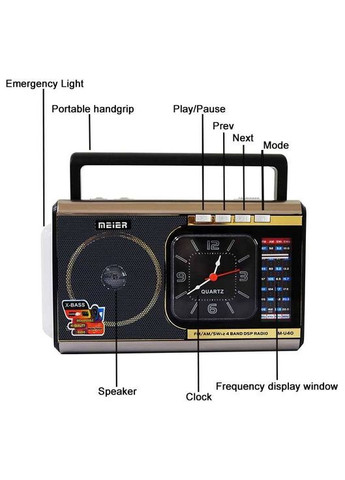 Портативное радио Shenzen Meier MU-40 с LED-лампой, поддерживающее AM/FM/SW 4 диапазона, встроенным MP3 плеером (USB/TF карты) и кварцевыми часами. Оснащено перезаряжаемой батареей и поддерживает подключение через AUX для других устройств. Отлично подходит для использования дома или на природе.