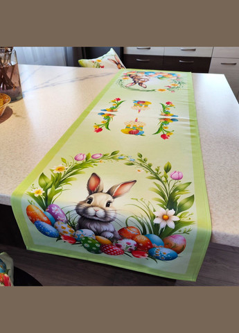 Ранер на стол пасхальный, Скатерть-дорожка водоотталкивающая, изготовлена из плотной, высококачественной полиэстровой ткани с легким сатиновым блеском. Красивая праздничная дорожка на столе нежного салатового цвета с пасхальными кроликами, пасочками и писанками. Водоотталкивающее покрытие дорожки создает водо и грязеотталкивающий эффект. Ткань легко стирается и долговечна. Настольная дорожка – наперон, стойкая к загрязнениям, легко чистится с помощью мыльного раствора и губки, можно стирать в машине при температуре 30-40 градусов в деликатном режиме. Состав: 100% - полиэстр Плотность ткани – 200 г/м2 Пожалуйста, обратите внимание, что из-за световых эффектов, яркости, контрастности монитора и других настроек могут быть некоторые незначительные различия в тонах/оттенках цвета фотографии веб-сайта и фактического продукта.