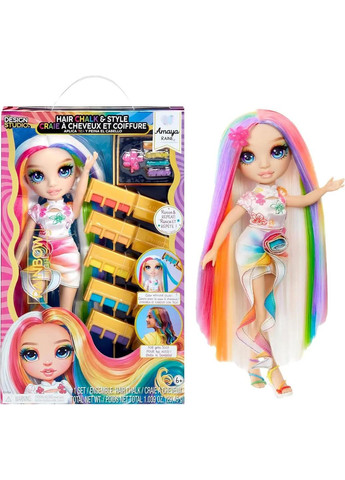 Игровой набор Rainbow High Мел для волос и стиль Амая – это мечта для всех юных стилистов и фанатов фэшн-кукол Rainbow High! Этот набор позволяет не только играть с любимой куклой Амаей Рейн, но и экспериментировать с ее фирменными радужными волосами, создавая уникальные образы с помощью цветного мела и аксессуаров для укладки. В набор входит специальный мел для волос, который позволяет легко и безопасно добавлять новые яркие пряди в волосы Амаи. Этот мел легко наносится и смывается, что позволяет много раз менять прически, не повреждая куклу. Это также безопасно для детей, если мел случайно попадет на кожу.