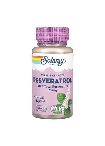 Ресвератрол 75 мг Solaray Resveratrol, 60 веган капсул Solaray Resveratrol 75 mg — это пищевая (диетическая) добавка в веган-капсулах для удобного дополнения ежедневного рациона взрослых. Формула сочетает экстракт корня/корневища японского спорыша (источник ресвератрола) и экстракты винограда (кожура, косточки и красное вино). Не является лекарственным средством. Основные особенности Сочетание источников полифенолов: японский спорыш (Polygonum cuspidatum) и виноград (Vitis vinifera). Стандартизация: в порции гарантировано содержимое всего ресвератрола — 30 мг, в т.ч. транс-ресвератрола — 15 мг (по данным этикетки). Веган-капсулы: подходит для рациона без продуктов животного происхождения. Состав и пищевая информация (на порцию) Размер порции: 1 VegCap | Порций в контейнере: 60 Компонент Количество на порцию % от суточной нормы* Японский спорыш (Polygonum cuspidatum), экстракт корня/корневища гарантированно содержит 30 мг (40%) общего ресвератрола, в т.ч. 15 мг (20%) транс-ресвератрола 75 мг — Виноград (Vitis vinifera), экстракт из кожуры гарантированно содержит 20 мг (20%) полифенолов 100 мг — Виноград (Vitis vinifera), экстракт из косточек гарантированно содержит 47,5 мг (95%) полифенолов, включая OPC 50 мг — Экстракт красного вина (Vitis vinifera L.) гарантированно содержит 4,8 мг (24%) полифенолов 25 мг — * Для указанных ингредиентов суточная норма (%DV) может быть не установлена. Другие ингредиенты Целлюлоза; вегетарианская капсула (растительная целлюлоза); смесь органического рисового экстракта; диоксид кремния; мальтодекстрин (из non-GMO кукурузы). Способ применения Обычно употребляют по 1 капсуле 2 раза в день во время еды или с водой. Точный режим см. на этикетке изготовителя. Не превышать рекомендуемое количество. Оговорки Это пищевая добавка, не является лекарственным средством и не предназначена для диагностики, лечения или профилактики заболеваний. Перед использованием внимательно прочтите информацию на упаковке. При индивидуальной чувствительности к компонентам прекратите использование. Период беременности/лактации, прием лекарства или наличие особых состояний — применяйте только после консультации со специалистом. Хранить плотно закрытым в сухом, прохладном месте, вне доступа детей.