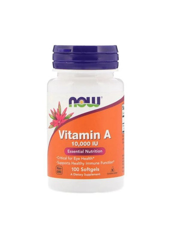 Витамин А является незаменимым микронутриентом, отвечающим за хорошее зрение, здоровье кожи и всех слизистых оболочек организма. Первыми признаками недостатка витамина А является быстрая утомляемость, восприимчивость к инфекциям, гиперкератоз локтей и колен, сухость и угри на коже. Ключевые особенности: Активизирует иммунные процессы в организме. Поддерживает здоровье глаз и кожи. Важен для роста костей. Здоровье глаз и кожи Защита на клеточном уровне Поддержка иммунитета Витамин красоты Максимальная биодоступность Витамин А также важен для здорового состояния слизистых. Он препятствует образованию налета на языке, нормализует пищеварение за счет действия эпителия желудка, препятствует инфекциям дыхательных путей. Диетическая добавка содержит 10000 МЕ (3000 мкг) витамина А в форме ретинолпальмитата и рыбьего жира (для лучшего усвоения). С полным перечнем ингредиентов можно ознакомиться в свойствах продукта. Дополнительные ингредиенты: Бычий желатин (без BSE), глицерин, вода, органическое оливковое масло первого отжима. Содержит рыбу (треска, сайра, морской окунь, минтай). Дополнительная информация: Не содержит глютен, ГМО, пшеницу, молоко, орехи, сою, яйца, кукурузу, моллюски и их производные. Вегетарианский, кошерный, халяльный продукт. Не является лекарственным средством. Соответствует стандарту качества GMP: Диетическая добавка отвечает требованиям к производству и контролю качества лекарственных препаратов GMP - Good Manufacturing Practice (Надлежащая Производственная Практика), имеет сертификацию уровня А. Этот сертификат означает, что при производстве продукции NOW Foods каждый технологический процесс тщательно исследован лабораторными методами, а также прошел тесты на стабильность, активность и рецептуру. Имеет сертификацию FDA USA (Food and Drug Administration of USA – Управление по санитарному надзору за качеством пищевых продуктов и медикаментов в США). Принимать 1 шт в день во время еды.