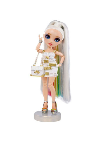 Кукла Rainbow High (Рейнбоу Хай) Fantastic Fashion Виолетта – стильная красавица с волосами и одеждой белого цвета. Встречайте Rainbow High серии Fantastic Fashion, состоящую из 6 куколок в стильных образах! Впервые в истории вы увидите платья, разработанные любимыми куклами в 1 сезоне мультсериала. Собери их всех, чтобы создать свою модную и стильную радугу! Эти невероятные красавицы покорят сердца всех девушек: они стильны, ярки и не боятся показать себя настоящих. Основные преимущества: у кукол невероятные стеклянные глаза с "настоящими" ресницами длинные роскошные волосы можно расчесывать и создавать новые прически у кукол есть точки артикуляции: колени, локти и запястья в наборе два стильных комплекта одежды: платье для подиума и повседневный комплект аксессуары для игры в дизайнера: скетчбук и карандаш для создания новых моделей платьев куколки Rainbow High вдохновляют девочек создавать и развивать творческий внутренний мир яркие цвета побуждают каждую быть уникальной и индивидуальной, выразить себя по-своему. Характеристики В набор входят: 1 кукла, 2 комплекта одежды, 1 пара обуви, 1 пара сережек, 1 расческа, 1 скетчбук, 1 карандаш, 1 подставка для куклы Высота куклы: 28 см Производитель: Rainbow High, Китай. Рекомендовано для детей от 4 лет.