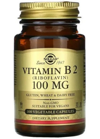 Витамин B2 (рибофлавин, лактофлавин) — один из наиболее важных водорастворимых витаминов. Рибофлавин является биологически активным веществом, играющим важную роль в поддержании здоровья человека. Биологическая роль рибофлавина определяется вхождением его производных — коферментов — в состав большого числа важнейших окислительно-восстановительных ферментов. Рибофлавин стабилен в кислотной и быстро разрушается в щелочной среде. Витамин B2 необходим для образования эритроцитов, антител, для регуляции роста и репродуктивных функций в организме. Он также необходим для здоровой кожи, ногтей, роста волос и в целом для здоровья всего организма, включая функцию щитовидной железы. Продукты с наибольшим содержанием витамина B2: печень и почки, яйца, миндаль, грибы, творог, гречневая крупа, молоко, мясо, дрожжи. Внешними проявлениями недостаточности рибофлавина у человека являются поражения слизистой оболочки губ с вертикальными трещинами и слущиванием эпителия, изъязвления в углах рта, отёк и покраснение языка, себорейный дерматит на носогубной складке, крыльях носа, ушах, веках. Часто развиваются также изменения со стороны органов зрения: светобоязнь, васкуляризация роговой оболочки, конъюнктивит, кератит и в некоторых случаях — катаракта. В ряде случаев при авитаминозе имеют место анемия и нервные расстройства, проявляющиеся в мышечной слабости, жгучих болях в ногах и др. Основные причины недостатка рибофлавина у человека — недостаточное потребление молока и молочных продуктов, являющихся главными источниками этого витамина; хронические заболевания желудочно-кишечного тракта, приём медикаментов являющихся антагонистами рибофлавина. Человеческий организм не накапливает рибофлавин, и любой избыток выводится вместе с мочой. При избытке рибофлавина моча окрашивается в ярко жёлтый цвет. Состав: одна капсула содержит 100мг рибофлавина(Б-2) Принимать по одной капсуле в день во время еды,запивая водой