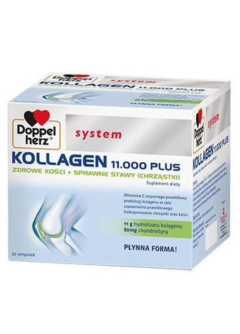 Doppelherz System Kollagen 11.000 Plus – это диетическая добавка, предназначенная для потребления, чтобы обеспечить организм ингредиентами, поддерживающими поддержание здоровых костей и функциональных суставов. Коллаген Доппельгерц – диетическая добавка в виде легкой для потребления жидкости, заключенной в отдельные ампулы, содержащие суточную дозу препарата. Продукт совмещает в себе 11 000 мг жидкого Collagen Peptan в форме коллагеновых пептидов, витаминов (C и D) и минералов (медь и селен). Коллаген является основным строительным материалом для хрящей и сухожилий, Витамин С поддерживает выработку коллагена в организме, Витамин D помогает поддерживать здоровые и крепкие кости, Медь поддерживает надлежащее состояние соединительных тканей, Селен снимает боль в суставах. Показания Питьевой коллаген – это диетическая добавка, созданная для людей, желающих улучшить состояние кожи, костей, хрящей и сухожилий. Ингредиенты Вода, гидролизат коллагена Peptan®, фруктоза, кислота (лимонная кислота), хондроитин сульфат, L-аскорбиновая кислота, консервант (сорбат калия), ароматизатор, подсластители (цикламат натрия, ацесульфам-К, сахарин натрия), сульфат холекальциферол. Суточная порция (1 ампула) содержит: Peptan® гидролизат коллагена 11000 мг. Хондроитина сульфат - в том числе хондроитин 100 мг. Витамин С 60 мг. Витамин D 5 мкг. Медь 0,3 мг. ампули Коллаген Доппельгерц с жидкостью (25 мл) 1 раз в сутки. Перед использованием взболтать. Продукт готов к употреблению непосредственно из ампулы без необходимости разбавления в других жидкостях. Рекомендуется использовать его регулярно в течение более продолжительного периода времени (минимум 3 месяца). Диетическая добавка Доппельгерц предназначена для взрослых. Препарат не следует использовать детям и подросткам. Предупреждение и меры предосторожности Не превышайте рекомендованную суточную дозу. Сбалансированное и разнообразное питание и здоровый образ жизни имеют большое значение для поддержания хорошего здоровья. Диетические добавки нельзя использовать в качестве замены разнообразного питания. Не применять при повышенной чувствительности к любому из ингредиентов препарата. Не превышайте рекомендованную суточную дозу. Doppelherz System Kollagen 11.000 Plus и беременность Не рекомендуется принимать беременным. Doppelherz System Kollagen 11.000 Plus и грудное вскармливание Не рекомендуется применять кормящим грудью. Хранение Хранить в недоступном для детей месте. Упаковка: 30 ампул