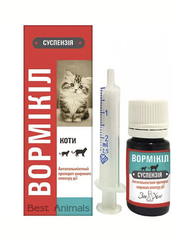 Суспензия от светло-желтого до желтого цвета. При хранении допускается выпадение осадка, который при взбалтывании растворяется. Суспензия для кошек Вормикил относится к комбинированным антгельминтным ветеринарным препаратам. Препарат оказывает антигельминтное действие на желудочно-кишечные нематоды и цестоды, паразитирующие у собак и кошек. Вормикол суспензия по степени воздействия на организм относится к веществам малоопасным (4 класс опасности), в рекомендованных дозах не оказывает эмбриотоксического, тератогенного и сенсибилизирующего действия, хорошо переносится собаками и котами разных пород и возраста. Применение: Вормикил суспензию назначают взрослым собакам и котам, щенкам и котятам с 3-недельного возраста с профилактической и лечебной целью при нематодозах (токсокароз, токсаскаридоз, унцинариоз, трихоцефалез, анкилостомоз), цестодиоз эхинококкоз, дифиллоботриоз, мезоцестоидоз) и смешанных нематодо-цестодозных инвазиях. Противопоказанием к применению препарата является индивидуальная непереносимость компонентов препарата (в том числе в анамнезе). Вормикил суспензию не следует применять самкам в первой половине беременности, щенкам и котятам младше 3-недельного возраста, истощенным, больным инфекционными болезнями и выздоравливающим животным. Не применять Вормикил суспензию одновременно с лекарственными препаратами, содержащими пиперазин и вещества, ингибирующие холинэстеразу. Дозировка: Вормикил суспензию применяют животным индивидуально, однократно с лечебной и профилактической целью, во время утреннего кормления с небольшим количеством корма или вводят принудительно на корень языка с помощью шприца-дозатора из расчета: Коты, котята, щенки мелких пород - 0.3 мл. Щенки средних и крупных пород, взрослые собаки – 1 мл на 3 кг. Перед применением флакон с препаратом следует тщательно взболтать. С лечебной целью, а также с целью профилактики при групповом содержании животных (питомники, приюты, виварии) обработку проводят двукратно с интервалом 14 суток при нематодозах один раз в сутки; при цестодозах и смешанных нематодо-цестодозных инвазиях один раз в сутки в течение трех суток подряд. Предварительной голодной диеты и применения слабительных средств не требуется. При сильной степени инвазии дегельминтизацию рекомендуется повторить через 10 дней. В профилактических целях дегельминтизацию проводят ежеквартально, а также перед каждой вакцинацией. Беременным самкам препарат назначают за 3 недели до предполагаемых родов с осторожностью, под наблюдением ветеринарного врача, кормящим самкам - через 2-3 недели после родов. Побочное действие: При применении Вормикила суспензии согласно рекомендациям, побочных явлений и осложнений у животных, как правило, не наблюдается. При повышенной индивидуальной чувствительности к компонентам препарата и появлению аллергических реакций его использование приостанавливают и назначают животному антигистаминные и симптоматические средства. У некоторых животных возможны нарушения в работе желудочно-кишечного тракта (жидкий стул, рвота), усиление слюноотделения, которые исчезают самостоятельно без применения лекарственных средств. При первом применении препарата у кошек возможна самостоятельно проходящая гиперсаливация. Передозировка: при значительной пере