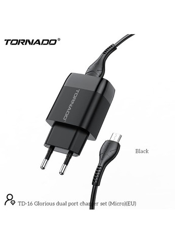 Сетевое зарядное устройство Tornado, модель TD-16, цвет черный в комплекте кабель USB Micro предназначен для зарядки цифровых устройств. Корпус из качественного огнеупорного пластика, в торце встроены два порта USB. Классическая сдержанная форма корпуса без острых углов. В комплекте с адаптером USB-кабель Micro. Подключить можно одновременно два гаджета и полностью автономно использовать как адаптер так и кабель. Если брать с собой в путешествие или на отдых стоит учесть, что там, где Вы должны быть должна присутствовать розетка электропитания. Блок питания станет отличной альтернативой оригинальному зарядному устройству. По техническим характеристикам ничем не уступает адаптеру, доставшемуся при покупке выбранного девайса или гаджета. Подходит для подзарядки смартфона, наушников, колонок, портативных аккумуляторов, электронных книг, сигарет, домашних аксессуаров и декора, которым необходима подзарядка. Оснащен защитой от перегрева и перепадов напряжения. Прослужит долгую службу при бережном обращении и соблюдении правил эксплуатации. Отлично справляется как зарядное для комплектующих к фото- и видеотехнике. Наш огромный выбор электроники, которую Вы можете подобрать себе на этом сайте, удовлетворит любой запрос даже самого взыскательного пользователя. При наличии дополнительных вопросов или, если нужна помощь в выборе, всегда поможет наш менеджер.