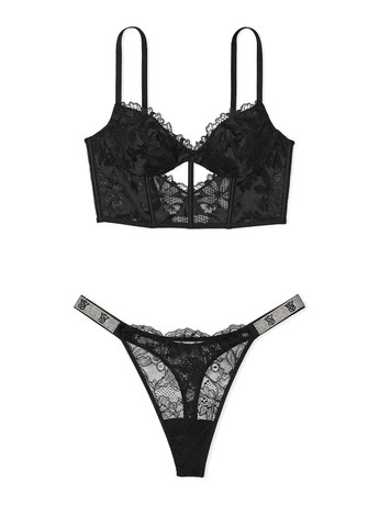 Роскошный комплект Victoria´s Secret корсетный топ и трусики тонг. Сетчатое кружево сочетается с гладкой тканью предает корсету романтический оттенок. Мягкая чашечка на косточках. Застежка на крючки сзади. Регулируемые бретели. Трусики тонг Victoria´s Secret. Трусики из цветочного кружева. Бретельки с фирменным логотипом, украшенные сверкающими стразами. Ластовица из хлопковой панели. Отличное качество.