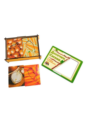 Дощечки Сегена "Овощи". Предложите малышу найти каждому овощу свой "домик-рамочку". Обратите внимание ребенка на то, что каждый овощ должен совпасть с нужным "домиком" не только формой, но и рисунком. Проговаривайте названия всех овощей, таким образом малыш запомнит их легко и быстро. Найдите с ребенком одинаковые вкладки (целых и в разрезе), сосчитайте их. Поговорите о том, какие эти овощи вкусны: кислые или соленые. В коробке: 18 досок с рисунками разных овощей. 1. Развитие логического и понятийного мышления. 2. С помощью такого методического материала дети познают окружающий мир. 3. Развивается мелкая моторика. Доставая и вставляя определенным образом детали сортера, отлично тренируются пальчики. 4. Работает зрительная память, тренируется внимание и усидчивость. Размер доски: 10х7,5см, коробки: 17,5х12х4см.