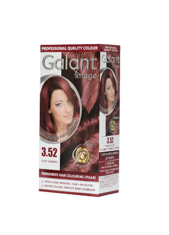 Стойкая крем-краска для волос Galant Image в оттенке 3.52 "Рубиновое лето" это : - интенсивный уход с кашемиром: протеины кашемира содержат 20 аминокислот, которые являются «строительным материалом» для клеток волос, что позволяет восстановить и укрепить его структуру, улучшить внешний вид и улучшить внешний вид; - шелковые пряди: в составе гидролизованные протеины шелка, которые активизируют обменные процессы в волосяной луковице и способствуют восстановлению и росту поврежденных волос; - надежное окрашивание седины. Кашемир-Бальзам – идеальное средство для восстановления ослабленных и поврежденных волос. Модные и яркие оттенки в сочетании с суперустойчивостью (уровень устойчивости 3). УФ-фильтр защищает волосы от выцветания под воздействием ультрафиолетового излучения. Здоровые волосы с защитной формулой COLOR-LIVE: - защитный комплекс фруктовых кислот и экстракта ромашки питает корни волос и придает им особую прочность; - натуральные увлажнители Провитамин В5 и глицерин сохраняют оптимальную влажность волос по всей длине. После окрашивания волосы остаются мягкими и здоровыми. Специальный бальзам-блеск с провитамином B5 стабилизирует полученный оттенок и усиливает блеск окрашенных волос и сохраняет яркость цвета на более длительное время.