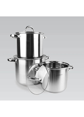 Набор Maestro MR-3510-6L состоит из 6 предметов: 3 кастрюли разных объемов с крышками. Предметы набора изготовлены из высококачественной нержавеющей стали. Многослойное термоаккумулирующее дно способствует равномерному распределению тепла. Набор предназначен для всех источников тепла, включая индукцию. Характеристики: Материал: высококачественная нержавеющая сталь Материал крышки: жаропрочное стекло с отверстиями для выпуска пара Ручки металлические Многослойное термоаккумулирующее дно Для всех типов плит Можно мыть в посудомоечной машине Состав набора: Кастрюля с крышкой диаметр 16 см - 1,6 л Кастрюля с крышкой диаметр 18 см - 2 л Кастрюля с крышкой диаметр 20 см - 3 л
