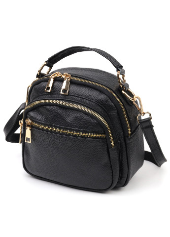 Цвет: черный; Материал: натуральная кожа высокого качества; Размер (ШхВхГ, см): 20х19х9 см; Страна производитель: Китай. Особенности: - одно основное отделение на молнии; - потайной карман на молнии на задней стенке и карман для телефона на передней; На лицевой стороне: - накладной кармашек на молнии; - встроенный горизонтальный карман на молнии; - на тыльной стороне карман на молнии; - цвет фурнитуры: золото; - кожаная ручка для переноса в руке; - регулируемый текстильно-кожаный ремешок на плечо. Стильная женская сумка компактного размера из натуральной кожи. Изделие очень удобное. Прекрасный вариант небольшой сумки на каждый день. Модель дополнена фурнитурой золотого цвета. Кожа мягкая и приятная на ощупь. Сумка прекрасно выносит непогоду. Внутри аксессуара прочная подкладка. В сумку с легкостью поместятся все самые необходимые вещи. С такой сумкой будет удобно хо
