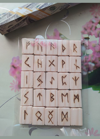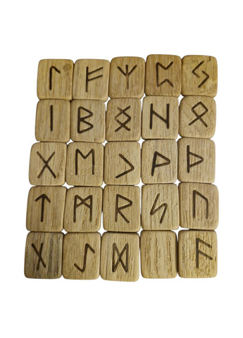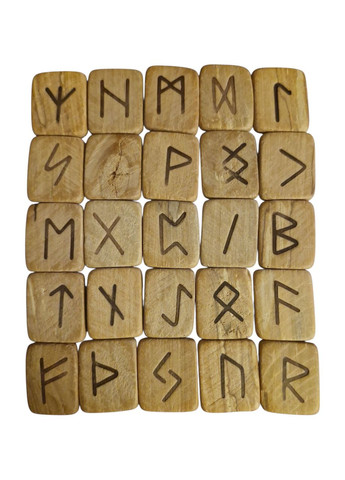 Набор деревянных рун(ель) для гадания, размер 30 Х 20 мм. Само слово runa означает «тайна», восходя к древнейшему индогерманскому корню со значением «прятать, скрывать». Его следы сохранились и в современных языках, сравним, например, немецкое raunen — «нашептывать», латышское runat — «говорить» или финское runo –"стихотворение, заклинание». Руны — магические и алфавитные знаки, использовавшиеся народами Европы от черноморского побережья до далекой Гренландии. Руны высекали на камнях или вырезали на дереве, ими украшали оружие, посуду, различные предметы, писали заклинания над входом в дом и на носах кораблей. Первые из сохранившихся рунических надписей относят к III в. н. э., однако многие знаки имеют гораздо более древнее происхождение, восходя к магическим символам кельтских жрецов-друидов. С течением веков начертание и значение знаков менялись. Долгое время они служили только для магических целей и для гадания: древние кельты, скандинавы и готы не знали письменности. Значение букв алфавита руны приобрели относительно поздно, после вторжения кельтов в Италию (IV в. до н. э. ). Одни знаки были переосмыслены, другие добавлены в подражание знакам латинского или, возможно, даже этрусского письма. Третьи так и не вошли в алфавит и для письма не использовались: их значение осталось чисто магическим и держалось в секрете от непосвященных. От кельтов рунная грамота перешла к германским, а потом и к скандинавским племенам. Разные племена создали разные модификации алфавита: так, на британских островах он состоял из 33 букв, в германских землях — из 24, а в далекой Исландии всего из 16 букв. Знатоки рун были магами и врачевателями; они носили особую одежду, учили молодежь и пользовались всеобщим уважением. Впрочем, в той или иной мере рунной грамотой владели все представители племени. Каждая руна имела собственное имя и связывалась с тем или иным божеством, предметом или явлением. Выкладывая руну из деревянных палочек или нанося ее изображение на березовую кору или камень, на древко копья или на поверхность глиняного сосуда, врачеватель, воин или охотник обращался непосредственно к той сущности, которую руна обозначала, чтобы воздействовать на нее определенным образом. Врачеватель изгонял болезнь, воин просил победы в бою, охотник привлекал добычу. Для усиления воздействия имя руны произносили или распевали в особой песни. Желая вызвать бурю, наслать болезнь или гибель на врага, пели т. н. «злую песнь» или совершали зейд — магический обряд, включавший пение и танец. Руническая магия Магией владели не только мужчины, но и женщины. Так, зейд вообще полагалось исполнять только женщинам; предсказанием будущего у древних норманнов занимались особые прорицательницы — волюры. С помощью песен и рун заклинали также духов и домовых, мертвецов и троллей. С приходом христианства рунический алфавит был признан «языческим» и быстро вытеснен из употребления. Попытка (вест-) готского епископа Вульфилы использовать руны для передачи текстов Священного Писания (IV в. н. э. ) не помогла: его труд был забыт даже раньше, чем погибло вестготское королевство. Латинский алфавит был удобнее. В среднем от принятия христианства до полного забвения рунных знаний проходило от трех до пяти столетий. Принципы «языческой» магии и древние легенды объявлялись вредным колдовством, 