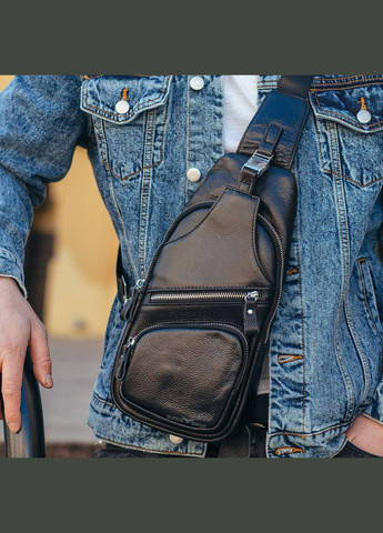 Черный кожаный мужской слинг на плечо TIDING BAG SK-63941 Характеристики: Производитель: TidinBag Тип: сумка-слинг Размеры (см): 18 х 33 х 5 Цвет: черный Материал: натуральная кожа Тип носки: через плечо Плечевой ремень: есть Длина плечевого ремня (см): 70-140 см Структура: (2) два больших отделения; (2) на лицевой стороне карман на молнии; (1) на тыльной стороне карман регулируемый ремешок. Описание: Сумка-слинг изготовлена из мягкой кожи с зернистой фактурой. Рюкзак оснащен текстильным плечевым ремнем с карабином, его можно подстроить как под правую, так и под левую руку. Сумка имеет два главных отделение на молнии, два дополнительных кармана с лицевой стороны на молнии. С тыльной стороны также есть карман открытого типа. Внутри главного отделения один маленький карман для мелочей.
