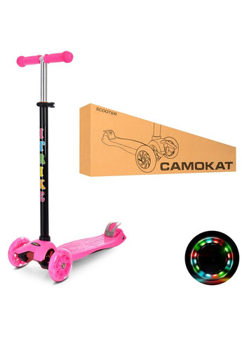 От 2-х лет Самокат обязательно понравится малышу и вас не оставит безразличными. Он поможет весело и с радостью проводить время, будет способствовать развитию координации движений и умению держать равновесие. Поворот колес в самокате осуществляется наклоном рулевой стойки в сторону поворота, такая система управления более понятна для маленьких детей. Нежный тормоз расположен над задним колесом обеспечит максимальную безопасность езды. Колеса светятся во время езды. В нашем магазине Вы можете купить самокат и превратить досуг в увлекательное времяпрепровождение. Характеристика самоката: Самокат подходит для детей от 2-х лет. Управление колесами в самокате осуществляется наклоном рулевой стойки в сторону поворота. Руль регулируется по высоте. Ручки прорезиненные. Самокат оснащен тремя колесами, обеспечивающими устойчивость и безопасность. Колеса выполнены из полиуретана. Подсвечиваются во время езды. Нежный тормоз расположен над задним колесом. Удобный для переноски и транспортировки. Материал: пластик, металл. Высота руля: 76-85 см. Размер платформы (ДхШ): 27х13 см. Диаметр колес: передние – 12 см, задние – 8 см. Упаковка: картонная коробка.