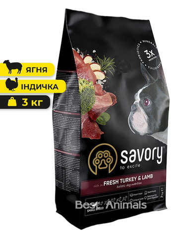 Сухой, полнорационный корм класса холистик для собак малых пород (вес – до 10 кг) – эксклюзивная рецептура корма была разработана опытными европейскими специалистами по питанию домашних любимцев. Им удалось, используя холистический подход, создать биологически подходящий здоровый рацион для собак, который является максимально полезным и питательным, и при этом вкусным. Общее состояние и здоровье Вашей собаки напрямую связано с тем, чем она питается. Для поддержания в отличном состоянии здоровья домашнего питомца рекомендуется максимально требовательно отнестись к выбору сухого корма. Для маленьких пород бренд Savory предлагает сбалансированный корм, содержащий в своем составе мясо индейки и ягненка (53%). Система естественной защиты организма будет безупречна благодаря наличию в питании необходимых витаминов. Энергетические потребности питомца будут в полной мере удовлетворены. Для того чтобы по максимуму сохранить все витамины и питательные вещества в процессе изготовления, не используются химические и искусственные добавки. Кроме того, полнорационный корм содержит в своем составе суперфуды, такие полезные фруктово-овощные добавки, как мякоть яблок, брокколи, а также шпинат. Форма и размер крокета оптимально подходит под анатомические особенности собак малых пород. Рацион Savory сочетает в себе яркий вкус и пользу. Он отлично подойдет для небольшой, но очень шустрой и энергичной собачки. Достоинства: ценный источник белка (мясо индейки и ягненка); содержащий уникальный комплекс пребиотиков, пробиотиков и минералов для укрепления иммунной системы; хондропротекторы в составе обеспечивают защиту суставам; суперфуды – здоровое пищеварение; диетическое мясо способствует поддержанию веса собаки в норме; активизация обмена веществ; для удобства жевания корм изготовлен в виде маленьких крокетов; не содержит красителей и ароматизаторов. Особенности: индейка – диетическое, высокобелковое мясо. Легко усваиваемое, содержащее жизненно необходимые минералы: селен, цинк, натрий, фосфор, магний, калий и витамины группы B; ягненок – гипоаллергенное, нежнейшее мясо. Отличный источник легко усваивающегося белка. Мясо ягненка богато витаминами, микроэлементами, лецитином и не содержит холестерин; яблоки содержат пребиотики (олигосахариды), улучшающие микрофлору кишечника; масло лосося – источник ценных жирных кислот Омега-3. Поддерживает иммунитет, а также придает блеск шерсти питомца; белый рис – диетический ингредиент, облегчающий работу пищеварительного тракта; брокколи содержит витамин С, активизирует работу иммунной системы. Растворная клетчатка используется для профилактики диареи; молоко кокоса оказывает противовоспалительный эффект и борется с вредными бактериями, препятствуя их размножению. Способствует пищеварению, улучшает состояние кожи и работу сердца; семена чиа – высокое содержание кальция, антиоксидантов, ненасыщенных жирных кислот; семена киноа – суперфуд, содержащий калий, рутин, минеральные соли, каротин, эфирные масла, а также важные для работы желудочно-кишечного тракта пектин и клетчатку; помидоры - источник антиоксидантов, которые имеют выраженный противовоспалительный эффект и улучшают состояние кожного покрова, мозговую и сердечную деятельность; Шпинат – колодец витаминов группы В. Он сниж