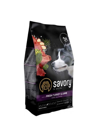 Корм класса холистик для взрослых собак средних пород весом от 10 до 25 кг. Полнорационный сухой корм для собак средних пород Savory пробудит у вашего любимца ту жизненную энергию, о которой он даже сам не знал. Эксклюзивная рецептура корма была разработана опытными европейскими специалистами по питанию домашних любимцев. Используя холистический подход, удалось создать биологически соответствующий, здоровый рацион для собак, который является полезным и вкусным настолько, что лапки оближешь. Сочетание отборных натуральных ингредиентов дает возможность заботиться о здоровье четвероногого, а изысканный вкус - дарить ему наслаждение от ежедневного потребления корма Savory. Сухой корм для собак средних пород Savory содержит 50% качественного мяса индейки и ягненка, суперфуды, цуккини, шпинат и помидоры. Эти компоненты созданы природой для всегда бодрого и жизнерадостного песика. Преимущества: Ценный источник белков - мясо индейки и ягненка. Уникальный комплекс пребиотиков, пробиотиков и минералов для укрепления иммунитета. Поддержание оптимального веса - равномерный набор мышечной массы без откладывания жира. Суперфуды для гармоничного развития и комфорта пищеварения. Содержит хондропротекторы для защиты суставов. Сбалансированный низькозерновой состав. Гипоаллергенные ингредиенты. Без красителей и ароматизаторов. Особенности: Ягненок является наиболее гипоаллергенным и нежным источником белка, легко усваивается организмом. Не содержит холестерина, богато витаминами, микроэлементами и лецитином. Индейка - высокобелковое диетическое мясо, которое легко усваивается и имеет в своем составе жизненно важные минералы: селен, цинк, натрий, фосфор, магний, калий и витамины группы B. Яблоки являются источником пребиотиков (олигосахаридов), улучшающие здоровье микрофлоры кишечника. Лососевое масло насыщенное жирными кислотами Омега-3, которые повышают общий иммунитет и придают блеск шерсти. Белый рис - диетический компонент с благоприятным действием на пищеварительную систему. Цуккини богатые витамином С для укрепления иммунитета и являются источником растворимой клетчатки для нормализации процессов пищеварения. Кокосовое молоко имеет интенсивное противовоспалительное и антибактериальное действие. Улучшает работу ЖКТ, состояние кожи и сердца, поддерживает оптимальную кондицию организма. Семена чиа - суперфуд с высокой концентрацией кальция, антиоксидантов и ненасыщенных жирных кислот для правильного функционирования организма животного. Семена киноа содержат калий, рутин, минеральные соли, каротин, эфирные масла, а также важные для работы желудочно-кишечного тракта пектин и клетчатку. Помидоры являются источником антиоксидантов, которые имеют интенсивный противовоспалительный эффект, улучшают состояние кожи, работу мозга и защищают сердце. Шпинат - источник витаминов группы В. Этот компонент снижает процессы окисления в организме и нормализует артериальное давление. Корм Savory - полезное может быть вкусным!
