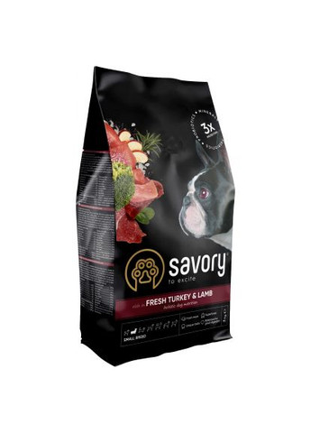 Корм класса холистик для собак малых пород весом до 10 кг.Сухой корм для собак малых пород Savory содержит 53% качественного мяса индейки и ягненка, суперфуды, яблоки, брокколи, шпинат. Эти компоненты созданы природой для небольшого, но очень активного песика. Гранулы корма разработаны с учетом анатомических особенностей собак малых пород.Особенности:• Индейка - высокобелковое диетическое мясо, которое легко усваивается и имеет в своем составе жизненно важные минералы: селен, цинк, натрий, фосфор, магний, калий и витамины группы B.• Ягненок является наиболее гипоаллергенным и нежным источником белка, легко усваивается организмом. Не содержит холестерина, богато витаминами, микроэлементами и лецитином.• Яблоки являются источником пребиотиков (олигосахаридов), улучшающие здоровье микрофлоры кишечника.• Лососевое масло насыщенное жирными кислотами Омега-3, которые повышают общий иммунитет и придают блеск шерсти.• Белый рис - диетический компонент с благоприятным действием на пищеварительную систему.• Брокколи - это растворимая клетчатка для профилактики диареи и источник витамина С для активации иммунитета.• Кокосовое молоко имеет интенсивное противовоспалительное и антибактериальное действие. Улучшает работу ЖКТ, состояние кожи и сердца, поддерживает оптимальную кондицию организма.• Семена чиа - суперфуд с высокой концентрацией кальция, антиоксидантов и ненасыщенных жирных кислот для правильного функционирования организма животного.• Семена киноа содержат калий, рутин, минеральные соли, каротин, эфирные масла, а также важные для работы желудочно-кишечного тракта пектин и клетчатку.• Помидоры являются источником антиоксидантов, которые имеют интенсивный противовоспалительный эффект, улучшают состояние кожи, работу мозга и защищают сердце.• Шпинат - источник витаминов группы В. Снижает процессы окисления в организме, нормализует артериальное давление.Корм Savory - полезное может быть вкусным!