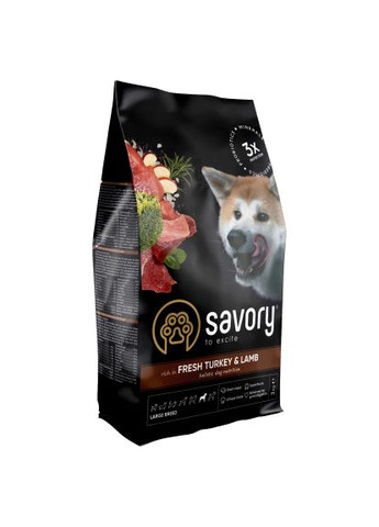 Корм класса холистик для собак крупных пород от 25 кг.Сухой корм для собак крупных пород Savory содержит качественное мясо индейки и ягненка, суперфуды, помидоры, чечевицу и цуккини. Эти компоненты созданы природой для оптимальной кондиции, крепких мышц и здоровых суставов четвероногих гигантов.Особенности:• Индейка - высокобелковое диетическое мясо, которое легко усваивается и имеет в своем составе жизненно важные минералы: селен, цинк, натрий, фосфор, магний, калий и витамины группы B.• Ягненок является наиболее гипоаллергенным и нежным источником белка, легко усваивается организмом. Не содержит холестерина, богато витаминами, микроэлементами и лецитином.• Чечевица насыщенная цинком, калием, железом, магнием и марганцем, что важно для стабильной работы нервной системы.• Яблоки являются источником пребиотиков (олигосахаридов), улучшающие здоровье микрофлоры кишечника.• Лососевое масло насыщенное жирными кислотами Омега-3, которые повышают общий иммунитет и придают блеск шерсти.• Белый рис - диетический компонент с благоприятным действием на пищеварительную систему.• Цуккини богатые витамином С для укрепления иммунитета и являются источником растворимой клетчатки для нормализации процессов пищеварения.• Кокосовое молоко имеет интенсивное противовоспалительное и антибактериальное действие. Улучшает работу ЖКТ, состояние кожи и сердца, поддерживает оптимальную кондицию организма.• Семена чиа - суперфуд с высокой концентрацией кальция, антиоксидантов и ненасыщенных жирных кислот для правильного функционирования организма животного.• Семена киноа содержат калий, рутин, минеральные соли, каротин, эфирные масла, а также важные для работы желудочно-кишечного тракта пектин и клетчатку.• Помидоры являются источником антиоксидантов, которые имеют интенсивный противовоспалительный эффект, улучшают состояние кожи, работу мозга и защищают сердце.• Шпинат - источник витаминов группы В, снижает процессы окисления в организме, нормализует артериальное давление.Корм Savory - полезное может быть вкусным!