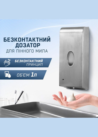 Сенсорный дозатор для пенного мыла – технологическое и максимально гигиеническое решение в сегменте индивидуальной гигиены! Бесконтактный диспенсер для мыла-пены не требует прикосновений для активизации работы, предотвращая перекрестное заражение инфекциями. Преимущества данной модели перед аналогами: бесконтактный принцип работы (сенсор автоматически срабатывает при поднятии руки к устройству); большой объем резервуара для мыльного раствора – 1,0 литр, что равно 1000 доз мыла; высокая скорость работы (быстрое реагирование сенсора обнаружения движения: вся процедура бесконтактной подачи мыла займет не более 3-4 секунд и быстрая перезарядка дозатора мылом), что позволяет избежать скопления очереди у диспенсера; может работать автономно от батарей или с подключением к электрической сети (блок питания от сети или 4 батарейки типа C предоставляются в комплекте с дозатором по выбору покупателя). В комплект входит все необходимое для монтажа диспенсера на стену (дюбеля и посадочная пластина для разметки позиций крепления на стене). Есть возможность дополнительно приобрести портативные стойки. Сенсорный диспенсер для пенного мыла может использоваться как в домашних условиях, так и в общественных местах: кафе; торговых центрах; кинотеатрах; учебных заведениях; в местах с повышенными требованиями к гигиене помещений (детских садах, кухнях, медицинских учреждениях). Диспенсер изготовлен из высококачественного металла, устойчивого к ультрафиолетовому излучению и механическим повреждениям. Герметичная упаковка картриджа исключает попадание загрязнений содержимого. Кроме того, дозатор можно закрывать ключом.