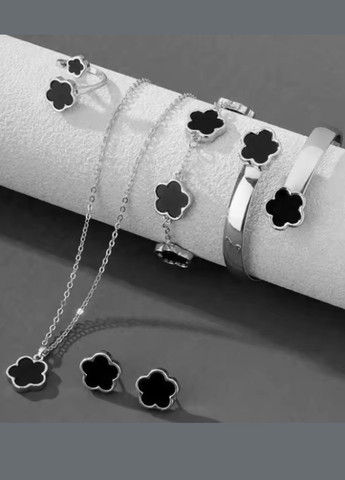 Набор бижутерии комплект колье, серьги, браслеты, кольцо с черным клевером Fashion Jewelry Серебристый. Набор состоит из: колье - 38 см + 4 см дополнительная цепочка, размер кулона клевера 1х1 см. браслет-цепочка 16 см + 4 см дополнительная цепочка, размер клевера 1х1 см. браслет каркасный - диаметр 6 см, с возможностью расширения, размер клевера 0,8х0,8 см кольцо - размер 17 см, с возможностью расширения. серьги гвоздики, размер клевера 1х1 см. Состав: 100% нержавеющая сталь. Бижутерия. Каждая деталь этого набора выполнена из высококачественных материалов и имеет неповторимый дизайн. Колье имеет красивую цепочку с удобной застежкой, которая позволит легко регулировать ее длину. Центральным украшением колье является черный клевер, символизирующий счастье и удачу. Серьги имеют такой же дизайн, как и колье, поэтому они отлично дополнят его. Они легки и удобны в использовании, а также подойдут для любого типа лица. Браслеты в наборе представлены в двух вариантах. Оба варианта очень элегантны и подойдут как для повседневного, так и вечернего использования. Кольцо также изготовлено из качественных материалов и имеет как центральный элемент клевер. Оно очень нежное и женственное, и будет отличным дополнением к другим украшениям из набора. Набор бижутерии комплект колье, серьги, браслеты, кольцо с черным клевером Fashion Jewelry– идеальный выбор для тех, кто любит стильные аксессуары и желает подчеркнуть свою уникальность и очарование. Он также может стать отличным подарком для вашей любимой, подруги или мамы. Носите этот набор с разными образами и наслаждайтесь его красотой и изысканностью! Уход за украшениями из метала (бижутерией): Изделия следует снимать перед душем, купанием, при уходе за кожей и избегать контакта с химикатами или абразивными веществами. После непредвиденного контакта с водой тщательно высушите украшения, аккуратно протирая мягкой безворсовой тканью. Мы предоставляем дополнительную информацию замеров по изделию, фото, видеообзору – по запросу покупателя. Пожалуйста, напишите нам в чат вопросы по товару при необходимости.