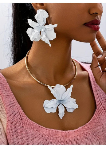 Набор ожерелье и серьги металлические цветы орхидеи белые стильные и волшебные украшения для модной леди! Размер цветов 8,5х8,5 см, диаметр скобы 11 см на примерный обхват в 34 см + цепочки за счет которых добавляется еще 15 см. Вес пары серьг 27 г. Состав: бижутерный сплав, металл, золотистое напыление (гвоздики металлические), эмаль.
