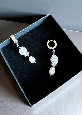 Серьги с жемчужинами и сахарным кварцем. Швенза из стали. Длина 4 см.