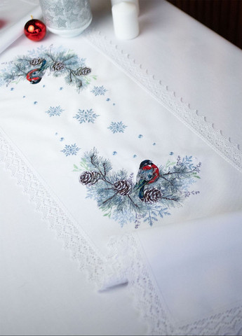 Глядя на эту дорожку, "Снегири" хочется с головой окунуться в волшебную атмосферу Рождества, где все родные и близкие собираются за семейным столом и делятся приятными воспоминаниями. Наша дорожка будет удачным дополнением к вашему новогоднему декору. Изысканная, белоснежная ткань в сочетании с вышитыми снегурами – гармоничный симбиоз, а нежное кружево по краям изделия, придает ему особый шарм и совершенство. Дорожка создана в сочетании 52% хлопка и модала 48%, качественные волокна гарантируют износостойкость и практичность в использовании. Такой ранер отлично дополнит скатерти и салфетки из этой же коллекции, создавая гармоничный образ для вашего праздничного стола.