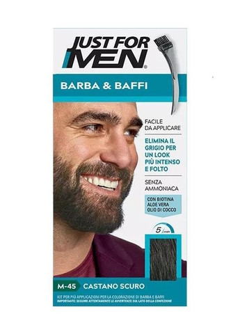 Краска для бороды и усов (без аммиака) Just For Men - один из ведущих мужских продуктов в мире по окрашиванию седины и придания волосам натурального цвета. Это замечательная возможность по-настоящему омолодить бороду, ведь краска от итальянского бренда обладает универсальной формулой, позволяющей не только окрасить щетину в насыщенный цвет, но также способствует смягчению и разглаживанию волос, поэтому, после нанесения краски, борода в течение всего нескольких минут полностью преобразится, без всякого следа седины! Вместе с этим, краска-камуфляж изготавливается из тщательно подобранной комбинации ингредиентов и не содержит аммиак, что делает применение Just For Men полностью безопасным даже при повторном окрашивании. - цвет - темно-коричневый Dark Brown; - подходит для всех типов волос; - стойкое безаммиачное окрашивание; - удобна в использовании; - естественный и натуральный оттенок; - результат окрашивания при умеренном умывании лица продлится от 4 до 6 недель; - краска устойчива к ежедневному умыванию, морской воде, лучам солнца (выгорание на солнце), пересыханию; - защищает от воды (в том числе морской) и воздействия ультрафиолетовых лучей; для индивидуального и профессионального применения. Краска для бороды и усов Just For Men очень проста в применении. Просто смешайте 2 аппликатора и равномерно нанесите на бороду и усы. Подождите 5 минут и смойте водой с шампунем. Краска имеет в составе фильтр, который блокирует ультрафиолетовые лучи UVA-UVB, что делает ее устойчивой к выгоранию. Данный продукт не дает эффекта блеска (даже на солнце) и не смывается водой, в том числе морской. В среднем одной упаковки хватает на 2 применения (в зависимости от длины волос), а цвет будет оставаться стойким на протяжении 4 - 6 недель. В комплект краски для бороды Just For Men входят: 1. Тюбик с краской (14 г) 2. Тюбик с активатором краски (14 г) 3. Перчатки 4. Кисточка аппликатор 5. Емкость для смешивания цвета и активатора 6. Инструкция Инструкции по применению: 1. наденьте перчатки; 2. выдавите содержимое из тюбика Color Base и из тюбика с цветным проявителем в пропорции 1:1; 3. тщательно перемешайте ингредиенты пластмассовой щеткой; 4. протрите отверстия тюбиков и закрутите крышки, чтобы в них не попал воздух; сразу же используйте смешанные ингредиенты, а остальные выбросьте или оставьте на следующий раз (использовать в течение 3 месяцев с момента открытия); 5. немедленно нанесите смесь на сухие волосы, используйте для этого кисточку, идущую в комплекте; 6. в зависимости от количества седых волос может потребоваться дополнительное нанесение, чтобы полностью покрыть их; 7. не втирайте краску в бороду пальцами; 8. аккуратно расчешите волосы вверх и вниз, чтобы средство равномерно покрыло их; ПОСЛЕ нанесения продукта подождите 5 МИНУТ или чуть меньше, чтобы предотвратить перекрашивание, и смойте тщательно краску с помощью шампуня
