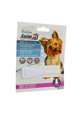 1 мл препарата каплей от блох и клещей AnimAll VetLine spot-on содержит действующие вещества: перметрин — 25%, имидаклоприд — 10%, пирипроксифен — 2%. AnimAll VetLine spot-on для собак — комбинированный инсектоакарицидный препарат, который применяется для профилактики и лечения собак при болезнях, вызванных эктопаразитами: блохами (Ctenocephalides canis, Pulex Irritans); вшами (Linognathus setosus); власоедами (Trichodectes canis); паразитиформными клещами (Ixodes spp, Hyalomma spp, Dermacentor spp, Haemaphysalis spp, Rhipicephalus spp, Boophilus calcaratus); чесоточными клещами (Sarcoptes canis); ушными клещами (Otodectes cynotis). Однократная обработка препаратом защищает животных от поражения блохами и клещами в течение 4-х недель. Применение: Препарат наносят на неповрежденную, сухую кожу. Удерживая тюбик-пипетку вертикально, отломать наконечник. Разделить шерсть животного и нанести препарат непосредственно на кожу между лопатками у основания шеи. При обработке крупных животных препарат наносить на кожу в 3-4 местах вдоль позвоночника, от холки до хвоста. Гибель паразитирующих на животном насекомых после обработки происходит в течение 12 часов, гибель или открепление клещей — в течение 48 часов. После однократной обработки животного, репеллентное действие средства продолжается до 4 недель. Повторные обработки при необходимости проводят 1 раз в месяц. Противопоказания: Повышенная чувствительность к компонентам препарата! Не использовать щенкам в возрасте до 9 недель и/или массой тела до 1.5 кг! Не использовать больным, истощенным и старым животным! Не применять котам! Предостережение: При обработке животных избегать попадания препарата в глаза, на слизистые оболочки, в ротовую полость. Не допускать контакта только что обработанных животных с другими животными. После обработки животных препаратом не позволять им купаться в водоемах в течение 48 часов. Хранение: хранить в упаковке производителя, в сухом, недоступном для детей и животных месте, отдельно от пищевых продуктов и кормов, при температуре от 5 до 25 град С. Применение: препарат применяют наружно непосредственно на кожу в местах, недоступных для слизывания (участок холки и вдоль позвоночника). Дозировка зависит от массы животного: Масса собаки — доза препарата: от 1.5 кг до 4 кг: 0.8 мл от 4 кг до 10 кг: 2.0 мл от 10 кг до 20 кг: 4.0 мл от 20 кг до 30 кг: 6.0 мл от 30 кг до 40 кг: 8.0 мл от 40 кг до 60 кг: 10.0 мл При терапии аллергического дерматита, вызванного блохами препарат можно использовать в сочетании с другими лекарственными средствами. AnimAll VetLine Spot-On целесообразно применять беременным и кормящим самкам, тем самым защищая кормилицу и щенков. Перед применением препарата на беременных и лактирующих самках, проконсультируйтесь с ветеринарным врачом. Препарат остается эффективным, даже если шерсть животного намокнет, однако длительного нахождения животного в воде рекомендуется избегать, с целью предотвращения снижения эффективности обработки. Если животное необходимо искупать с шампунем — рекомендуется использование шампуней торговой марки AnimAll за 3 дня до применения VetLine Spot-On. Срок годности 3 года.