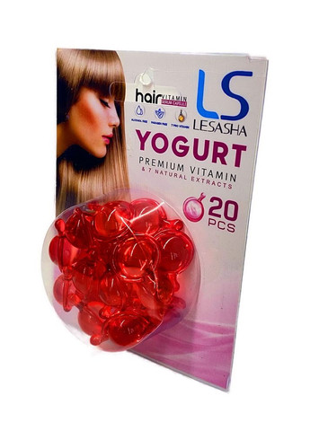 Тайские капсулы для волос Lesasha Hair Serum Vitamin c йогуртом - формула для поврежденных, сухих, вьющихся волос, от перхоти и зуда. Капсулы с йогуртом подходят для любых прядей: жирных, нормальных или сухих. Особенно он порадует обладателей комбинированного типа волос – с быстро жирнеющими корнями и ломкими концами. В состав витаминных капсул входят 7 уникальных питающих масел: Масло макадамии - проникает глубоко внутрь стержня волоса, питая и восстанавливая его, а так же создает вокруг каждого волоса "алмазный щит", который предохраняет волосы от дальнейшего разрушения. Волосы приобретают мягкость, становятся послушными, разглаживаются по всей длине, а также насыщаются необходимыми для них витаминами и микроэлементами, придавая естественный блеск и сияние. Масло льняное - способствует хорошему увлажнению волосяного покрова, ведь без поддержания необходимого уровня влажности волосы не будут достаточно мягкими и послушными. Особенно оживляются под воздействием масла жожоба сухие, ломкие и тусклые волосы. Масло создаёт на волосах защитный слой, оберегает их от негативного влияния и сохраняет живительную влагу. Аргановое масло- оказывает интенсивное питательное и увлажняющее действие, увлажняет кожу головы, способствует ее регенерации и устраняет перхоть, восстанавливает структуру волос, стимулирует их рост и предупреждает выпадение, устраняет секущиеся кончики, защищает от пагубных ультрафиолетовых лучей. Масло авокадо обладает питательными и увлажняющими свойствами. В нем сбалансированное количество белков, углеводов, насыщенных и ненасыщенных жирных кислот. Авокадо подходит для сухих, пористых, истощенных и поврежденных волос. Масло авокадо проникает в клетки волосяных луковиц, восстанавливает их структуру и природную силу, защищает волосы от ультрафиолетовых лучей и других агрессивных воздействий внешней окружающей среды. Масло оливы - богатое витаминами и жирными кислотами, превосходно увлажняет, питает, разглаживает поверхность каждого волоска, обволакивая его тончайшей защитной пленочкой. Этот ценный компонент не только защищает локоны от повреждений и пересушивания, но и восстанавливает их, заполняет пространство между чешуйками, насыщает глянцевым блеском, придает эластичность и силу. Масло подсолнечника - глубоко питает структуру волос, помогает избавиться от свободных радикалов, защищает волосы от химических повреждений, предотвращает заболевания кожи головы и волос. Прекрасно освежает и сохраняет цвет окрашенных волос. Масло кокоса - содержит в себе уникальные ненасыщенные жирные кислоты: лауриновая, пальмитиновая, линолевая, олеиновая, каприновая и каприловая, стеариновая, миристиновая, а так же витамины Е и К, железо и бетаины. Уникальность и эффективность кокосового масла выражается в его восстанавливающем воздействии. Активные компоненты: Йогурт богат аминокислотами, которые увлажняют и лечат посеченные локоны, а молочная кислота отшелушивает отмершие клетки. В нем много молочнокислых бактерий, стимулирующих рост волос и избавляющих от воспалений, зуда и перхоти. Кроме того, активные компоненты продукта бережно очищают кожу головы, питают локоны и делают их ухоженными.Йогурт же – натуральное противогрибковое и антибактериальное лекарство. Он устраняет болезнетворные микробы, а при регуляр