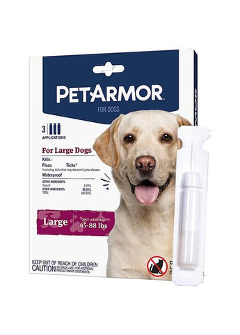 Препарат PetArmor – эффективный способ защиты собак от блох, клещей и вшей. Его защитные свойства от паразитов работают в течение 30 дней после однократной обработки животного. Капли на холку для собак ПЕТАРМОР убивают взрослых блох, являющихся основной причиной аллергического дерматита и анемии. Средство оперативно уничтожает клещей (Rhipicephalus sanguineus, Dermacentor variabilis, Amblyomma americanum, Ixodes scapularis), которые способны передавать пироплазмоз и болезнь Лайма. Заражение вшами прекращается немедленно. Состав капель включает фипронил – активный современный препарат против паразитов, рекомендованный ветеринарами. Фипронил блокирует ГАМК-зависимые рецепторы членистоногих, что приводит к нарушению передачи нервных импульсов, параличу и гибели паразитов. Фипронил накапливается в волосяных луковицах шерсти и жировых железах и не влияет на центральную нервную систему собак, а также не всасывается в кровоток. Средство устойчиво к воде. Через 24 часа собаку можно купать с использованием безсульфатных шампуней. Капли PetArmor с объемом 1 пипетки 4.02 мл предназначены для собак и щенков старше 8-ми недель и весом 40-60 кг. Если вес вашего питомца равен или превышает 60 кг, используйте соответствующую комбинацию пипеток PetArmor. Если вес собаки меньше 40 кг, используйте PetArmor меньшей дозировки. Обязательно взвесьте собаку, не угадывайте приблизительный вес, чтобы указанная на упаковке доза соответствовала весу животного. Почему стоит купить капли на холку для собак PetArmor: действующее вещество – фипронил: не влияет на центральную нервную систему собак, не всасывается в кровоток; длительное действие: обеспечивают защиту на 30 дней от заражения эктопаразитами; быстрый результат: уничтожает блох и клещей в течение 24 часов, в отдельных случаях может потребоваться до 48 часов; имеют высокую эффективность, поэтому при их использовании нет необходимости в дополнительных средствах обработки; широкий спектр действия: эффективный способ защиты собак от блох, клещей и вшей; убивают взрослых блох, являющихся основной причиной аллергического дерматита и анемии; уничтожают клещей (Rhipicephalus sanguineus, Dermacentor variabilis, Amblyomma americanum, Ixodes scapularis), которые способны передавать пироплазмоз и болезнь Лайма; устойчивы к воде: собаку можно купать через 24 часа после нанесения капель; легко и удобно использовать (см. Инструкцию); препарат предназначен только для собак. НЕ ИСПОЛЬЗОВАТЬ ДЛЯ КОТОВ. Цена на сайте указана за 1 пипетку. Вы можете купить капли от блох, клещей, вшей для собак и щенков 40-60 кг PetArmor поштучно или упаковкой (3 пипетки по 4.02 мл).