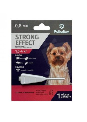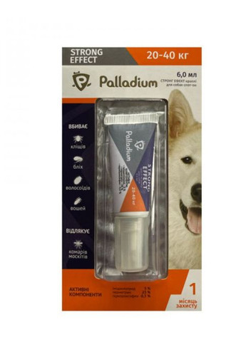 Капли на холке для собак Palladium Strong Effect – инсектоакарицидный препарат, предназначенный для уничтожения блох, иксодовых клещей, вшей и власоедов, паразитирующих на животных, защиты от нападения вышеупомянутых паразитов, комаров, москитов и других насекомых. Имидаклоприд – 5%, перметрин – 25%, пирипроксифен – 0,3%. Вспомогательные вещества: каприловый триглицерид, агидол, лимонная кислота, ПЭГ-400, N-метилпирролидон. Профилактика и лечение собак при поражении эктопаразитом: блохи (Ctenocephalides spp., раздражительная блоха); паразитоформные клещи (Ixodes spp., Dermacentor spp., Rhipicephalus spp.); вши (Linognathus setosus); власоеды (Trichodectes canis); отодектозные клещи (Otodectes cynotis); Хейлетиозные клещи (Cheyletiella spp.). Отпугивающее (репеллентное) действие на кровососущих двукрылых насекомых - комары (семейство Culicidae), оводы (семейство Tabanidae), мошки (семейство Simulidae), мокрицы (семейство Ceratopogonidae), москиты (семейство Psychodidaee). Препарат также можно применять для лечения аллергического блошиного дерматита. Препарат применять наружно, непосредственно на кожу пипеткой-капельницей в места, недоступные для слизывания (участок холки и вдоль позвоночника). В зависимости от массы тела животного капли на холке для собак Palladium Silver Defence применяют разной фасовки: Масса тела собаки (кг) Доза препарата (номинальный объем пипетки, мл) Количество мест нанесения от 1,5 до 4 0,8 1 от 4 до 10 2,0 1 от 10 до 2 0 2 40 8,0 4 Препарат наносить на сухую кожу. Держа вертикально пипетку, отламывают наконечник. Разделить шерсть животного и нанести препарат непосредственно на кожу между лопатками у основания шеи. При обработке крупных животных наносить препарат на кожу в 3-4 местах вдоль спины от холки до хвоста. Гибель паразитирующих на животном насекомых после обработки происходит в течение 12 часов, гибель или открепление клещей — в течение 48 часов. Репеллентное действие препарата против вшей, блох, волосоедов, двукрылых насекомых, а также клещей после одноразовой обработки животного длится до 4 недель. Повторные обработки при необходимости производить 1 раз в месяц. При терапии аллергического дерматита, вызванного блохами, целесообразно использовать в сочетании с лекарственными средствами патогенетической и симптоматической терапии. Препарат остается эффективным, даже если шерсть животного намокнет, однако длительного нахождения животного в воде рекомендуется избегать, с целью предотвращения снижения эффективности обработки. В таких случаях животное повторно нужно обработать каплями на холке Palladium Silver Defence для собак, но не чаще 1 раза в неделю. Если животное необходимо выкупать с шампунем – рекомендуется это сделать за 3 дня до применения препарата. Безопасность: Препарат прошел все клинические испытания. Безопасность препарата для животных полностью подтверждена (при условии использования согласно инструкции). Повышенная чувствительность к компонентам препарата! Не применять щенкам до 7 недель и/или массой тела до 1,5 кг! Не применять больным, истощенным и старым животным! Не применять кошкам! Предостережение: Применение препарата животных во время беременности и кормления грудью основывается на оценке риска и необходимости проведения обработки врачом ветеринарной медицины. Лица, работающие с препаратом, должны соблюдать основные правила гигиены и безопасности, принятые при работе с ветеринарными препаратами. При случ