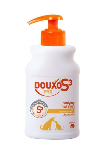 Это противогрибковый и антибактериальный ухаживающий шампунь, который способен контролировать микрофлору и поддерживать кожный покров. Он регулирует выделение кожного жира, а также отвечает за правильную микрофлору кожного покрова. К особенностям данного шампуня можно отнести наличие антисептических и противогрибковых свойств. Средство подойдет как кошкам, так и собакам для очищения кожного покрова и её дезинфекции. Преимущества шампуня Ceva (Сева) Douxo S3 Pyo Благодаря уникальной комплексной формуле гарантируется защита кожного покрова животного. Наличие уникальной рецептуры с адаптированным pH для кожи домашних животных. После использования шампуня на коже котов и собак остается защитная плёнка, которая увлажняет поверхность эпидермиса. Происходит удаление шелушащейся кожи и излишки кожного сала. Происходит стимуляция воспроизводства новых клеток кожи. Отсутствие парабенов, мыла, сульфатов, красителей и наночастиц в составе. Наличие дезодорирующих свойств. Уменьшение раздражения. Демократичная цена и экономичное использование препарата. Высокая эффективность и простота использования. Подходит животным, независимо от породы, размера и веса. Ophytrium (офитриум) – это очищенный природный ингредиент, входящий в список высокоэффективных веществ S3 (Safe Skincare Selection) из-за его высокой толерантности и одновременного тройного действия: Защита механического барьера для поддержания эластичности и увлажненности кожи. Сохранение защитного микробиологического барьера кожи. Уменьшение раздражения и успокоение кожи. Состав: офитриум, хлоргексидина биглюконат (CAS18472-51-0), пантенол, пентавитин. Мягкая очищающая формула, гипоаллергенный аромат. Инструкция по использованию: Только для наружного применения. Хорошо намочите шерсть теплой водой. Нанесите шампунь и помассируйте. Оставьте пену на 5-10 минут. Тщательно смойте под проточной водой. Частота использования: 2-3 раза в неделю в течение 3-4 недель. Противопоказания: Не применять животным с повышенной чувствительностью к компонентам препарата. Меры предосторожности: хранить в недоступном для детей месте. Избегать контакта шампуня с глазами, при попадании в глаза – осторожно промойте глаза проточной водой несколько минут. Фасовка: 200 мл. Производитель: Vectra, Ceva Sante Animale, Франция. Информация о товаре до обновления линейки производителем Шампунь Ceva DOUXO Pyo разработан и предназначен для борьбы с себорейным дерматитом, а также, других кожных заболеваний у котов и собак. Средство содержит активное вещество фитосфингозин – природный про-керамид, участвующий в строении липидов кожи, добывается с оболочек необработанных зерен овса. Компонент лечит и восстанавливает поврежденные аллергией участки кожи, создаёт природный защитный барьер кожного покрова. Вспомогательные вещества хлоргексидин и нитрат миноказола обладают мягким антисептическим воздействием, нейтрализуют всевозможные вредоносные бактерии, в том числе и грибковые. Содержание в составе масел кедра и карите оказывают мягкий увлажняющий эффект, поддерживают водный баланс эпидермиса. Экстракт зелёного чая придаст коже питомца приятный освежающий запах. Ceva DOUXO Pyo начинает действовать с первого дня применения и в течении 20 дней регулярного использования полностью устраняет визуальные признаки себореи, значительно уменьшает зуд