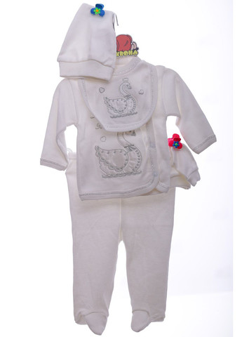 Набор 5в1 с Лебедем Производитель- Турция Трикотажный комплект состоит из пяти предметов: штанишки, распашонка, нагрудник, шапочка, царапки. Кофточка застегивается на кнопки. Штанишки на резинке. Шапочка на широкой резинке. Отлично подойдет в качестве подарка. Рост 56 см Образмерка Размер А - Окружность головы см B - Длина изделия от плеча см С - Полуобхват груди см D - Длина рукава от воротника см F - Длина по шаговому шву см G - Полуобхват талии см I - Длина изделия от пояса см 56 32 25 19 23 16 20 34 Таблица возрастов Размер Возраст 56 от 0м до 3м