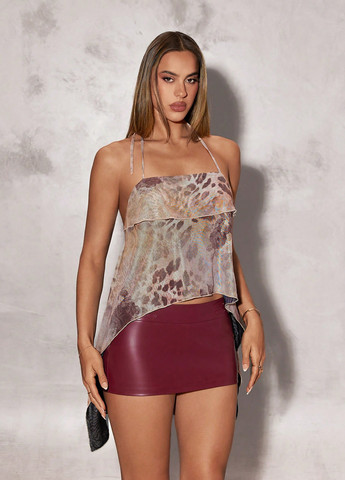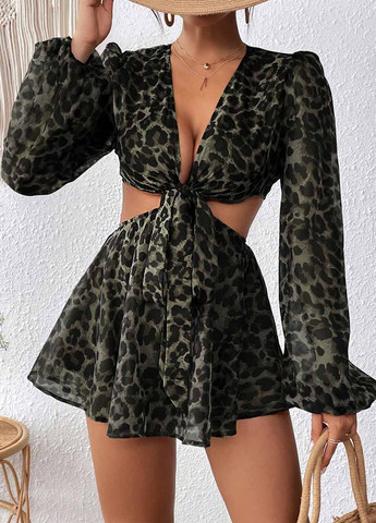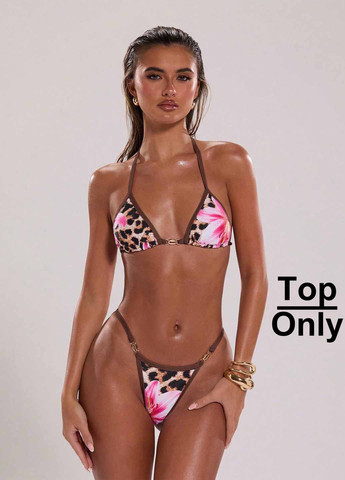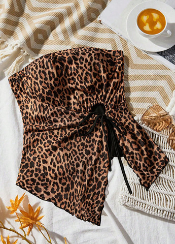 Комплект (лиф, трусики, юбка) SHEIN с леопардовым принтом. Предназначен для летнего пляжного отдыха и отпуска. Лиф-халтер, с треугольными чашечками. Низ – короткая юбка с завязками по бокам. В комплект входят съемные вкладыши.
