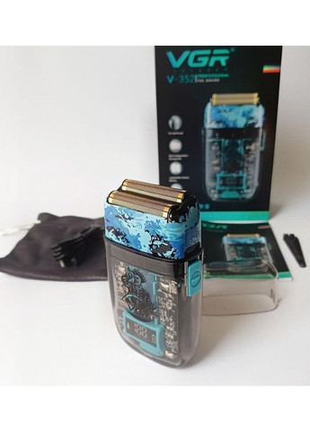 Электробритва VGR Professional Foil Shaver V-352 Blue Электробритва VGR Professional Foil Shaver V-352 Blue – это незаменимый инструмент для финальной стрижки, идеально подходящий как для бритья, так и для стрижки волос «под ноль». Незаменимая вещь для любого парикмахера, мастера или барбера. А также отличный инструмент для бритья в домашних условиях! Также шейвер подходит для бритья головы полностью наголо. Устройство бритья состоит из двух сеток и двух ножей. Сети модели являются гипоаллергенными. Сеть-картридж легко меняется при необходимости. Ножи модели V-352 Blue независимы и двигаются асинхронно, что значительно улучшает эффективность бритья. При необходимости ножи тоже могут быть заменены. Шейвер имеет два Li-Ion аккумулятора (2x600мАЧ), обеспечивающих 120 минут автономной работы. Аккумулятор может быть заряжен и заряжен в любой момент – он не обладает эффектом памяти. Для зарядки шейвера можно использовать любое зарядное устройство, в комплекте поставляется кабель USB Type-C. Корпус модели VGR Professional Foil Shaver выполнен из высококачественного прозрачного пластика. На корпусе есть кнопка включения-выключения, разъем для зарядки USB Type-C, LED-индикатор зарядки в процентах и уведомление о своевременной очистке ножей от щетины и кнопка для отсоединения головки, расположенной сбоку. Чтобы снять головку, нужно хорошо нажать кнопку – это сделано специально для того, чтобы во время работы Вы случайно не отсоединили головку и не повредили сетки с ножами. Водозащита по стандарту IPX5, позволяющая использовать шейвер, не опасаясь попадания воды. Особенности VGR Professional Foil Shaver V-352: Тип питания: аккумулятор/сеть (комбинированная), Мощный и функциональный Двойная бреющая система, Гипоаллергенные сетки из титана, Асинхронные ножи, Сетки и ножи легко изменяются, Время работы: 2 часа, Время зарядки: 0 часов Li-Ion аккумулятор, Зарядка от любой зарядки для телефона, Умеренный уровень шума во время работы, Вес: всего 180 г, Цвет: Прозрачный с синими внутри деталями, Страна-производитель: Китай. Комплектация: Шейвер VGR V-352 Кабель для зарядки USB Type-C Щеточка для очистки, Тканевый чехол для хранения шейвера. Сопроводительная документация