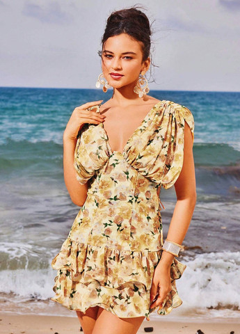 Элегантное платье с V-образным вырезом. Это платье имеет V-образный вырез и выгодно подчеркивает фигуру. Изготовлена из неэластичной шифоновой ткани с кружевной отделкой. Дизайн включает асимметричные оборки и разрезы до бедер. Это платье подходит для официальных мероприятий, таких как свадьбы и платья подружек невесты.