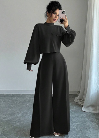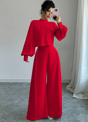Комфортный костюм выполнен из плотной костюмной ткани с декоративными лампасами. Пиджак с нижним подкладом и декоративными клапанами. Модель на пуговице с традиционным кроем. Брюки на эластичной резинке с широким прямым кроем и карманами. На поясе шнуровка.
