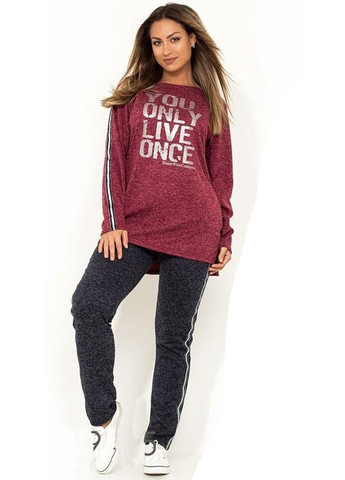 Лонгслив имеет изящный вырез «челнок», красиво подчеркивающий линию шеи и придающий образу легкости. Рукава без манжетов делают модель еще более комфортной и непринужденной. Особый акцент – стильный декор в виде надписи на груди, выполненный в тон брюк, придающий гармоничности всему комплекту.