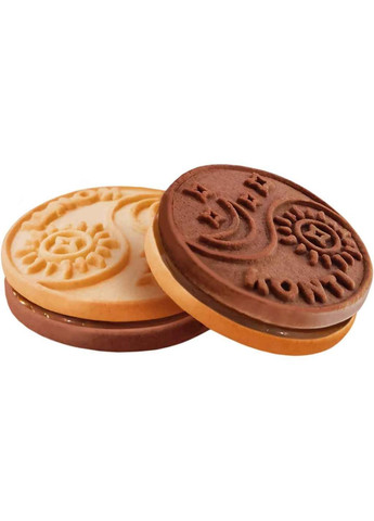 Два ванильных печенья – одно из молочным, другое с шоколадным вкусом, соединенные шоколадно-сливочным кремом.