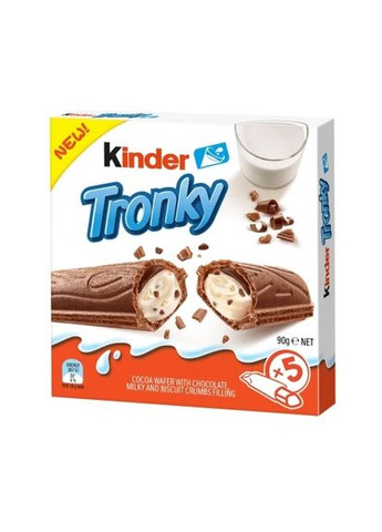 Kinder Tronky - это летний Хит, батончики, которые не растают в жару! Смело берите их в дорогу, на прогулку, перекусывайте на ходу. Трубочка из хрустящей шоколадной вафельки со слоем молочного шоколада и начинкой из нежнейшего молочного крема с бисквитными криспи. Потрясающе вкусно! В упаковке 5 батончиков Kinder Tronky. Нежнейший вкус и чудесное сладкое послевкусие)