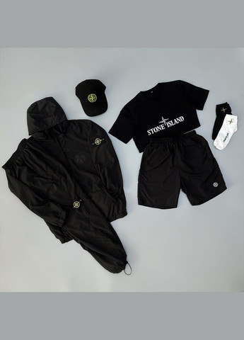 Костюм из матовой черной плащовки. Материал отлично защищает от ветра и мелкого дождя. Дизайн - минималистичный, с акцентом на функциональность и комфорт. Футболка черная идеально дополняет костюм, как практически, так и эстетически. Кепка идеально подойдет для полноты образа. Шорты отлично подойдут для бега, плавания или повседневного использования.